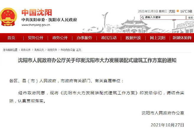 近日,沈阳市人民政府办公室印发《沈阳市大力发展装配式建筑工作方案的通知》,要求推进以装配式建筑为代表的现代建筑产业发展,促进建筑业转型升级。提出加大财政政策支持产业化装配式工程建设,每年预算安排建筑产业化示范工程建设扶持资金。单个项目*高补贴500万元,参与项目建设的相关企业可按照一定比例获得补贴资金。明确到2023年,全市新开工装配式建筑项目的建筑面积占新建建筑面积比例达到65%以上,商品房成品化比率达到70%以上。