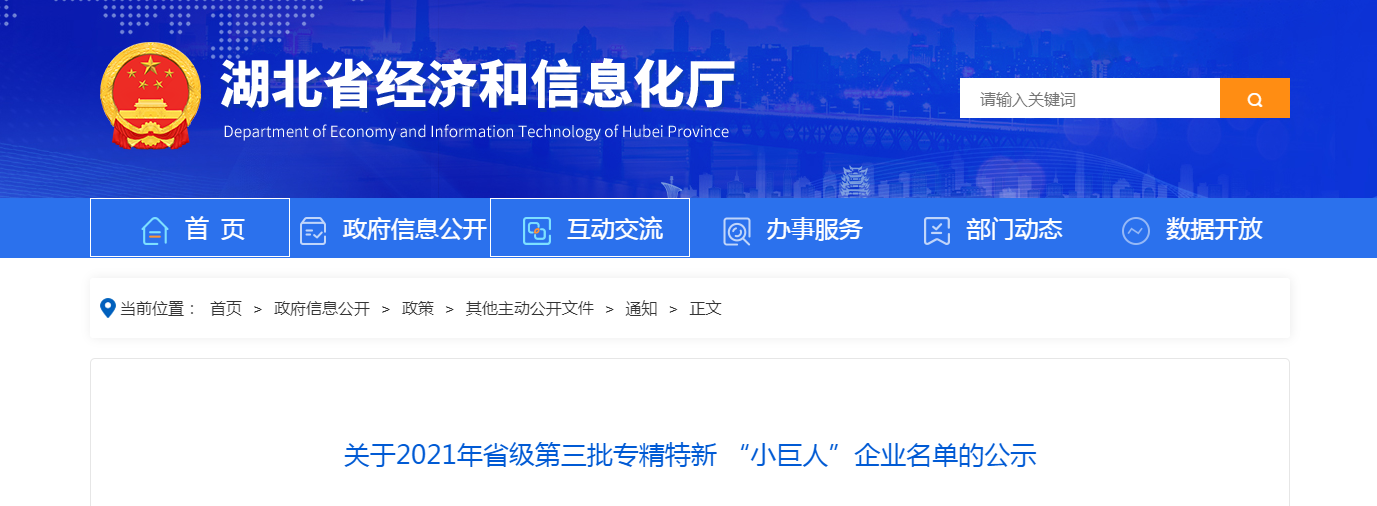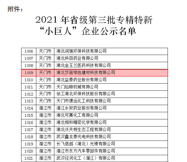 2021年12月17日,湖北省经济和信息化厅公示2021年度省级第三批专精特新“小巨人”企业名单,1025家企业通过审核,金莎丽也荣列其中!