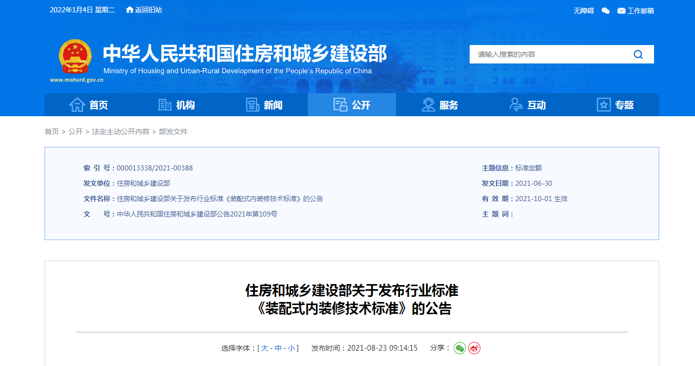 日前,由莎丽科技股份有限公司参与编制,住房和城乡建设部正式批准发布的国内首部《装配式内装修技术标准》在国家住建局官网公示。