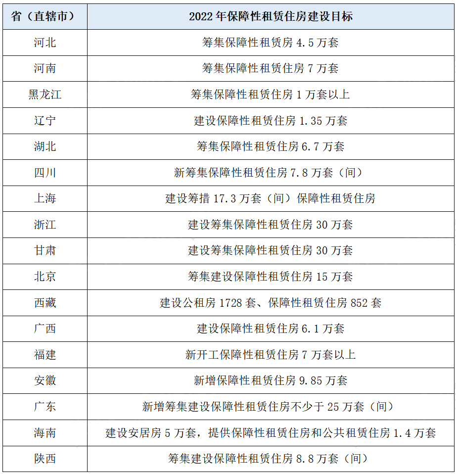 2021年全国40个正在建设保障性租赁住房的城市,计划新筹集保障性租赁住房93.6万套,已超额完成筹集计划。2022年各地保障性租赁住房建设目标如下: