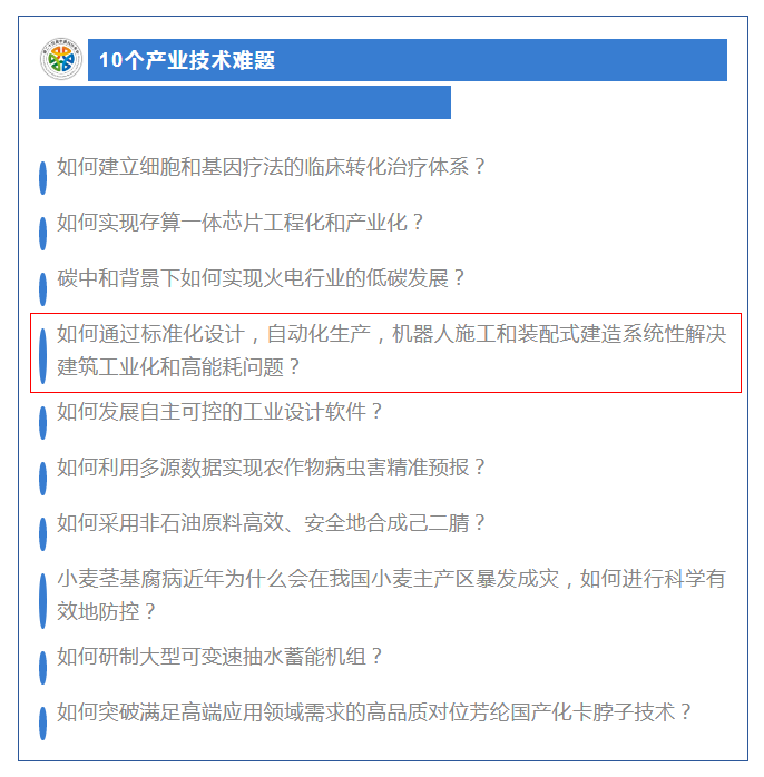 近日中国科协发布了10个对科学发展具有导向作用的前沿科学问题、10个对工程技术创新具有关键作用的工程技术难题和10个对产业发展具有引领作用的产业技术问题。其中,一个装配式建筑相关问题入选“产业技术问题”:如何通过标准化设计,自动化生产,机器人施工和装配式建造系统性解决建筑工业化和高能耗问题?