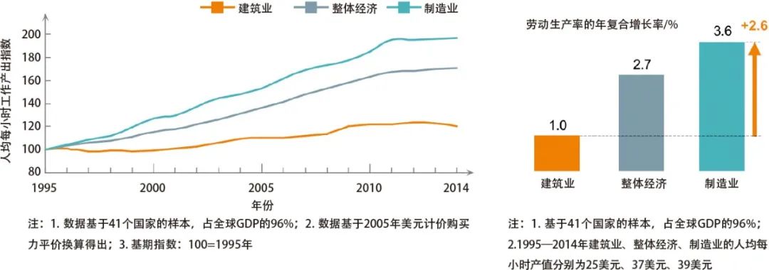 ▲ 全球制造业与建筑业生产率增长率比较(1995—2014年)