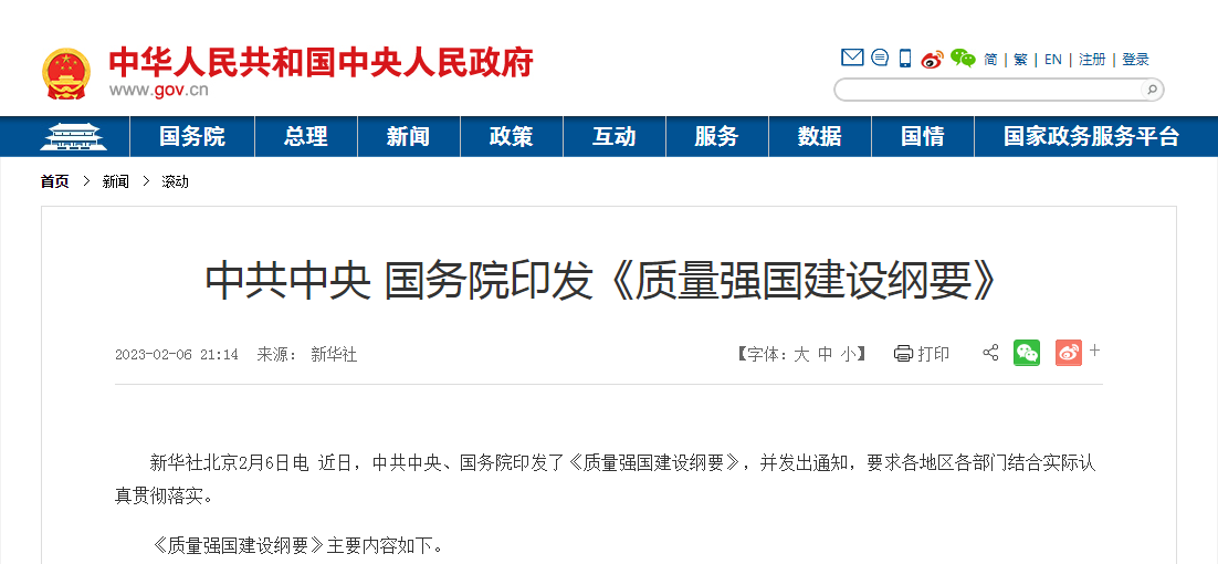 2月6日,中共中央、***印发了《质量强国建设纲要》。纲要指出,质量是人类生产生活的重要保障。建设质量强国是推动高质量发展、促进我国经济由大向强转变的重要举措。