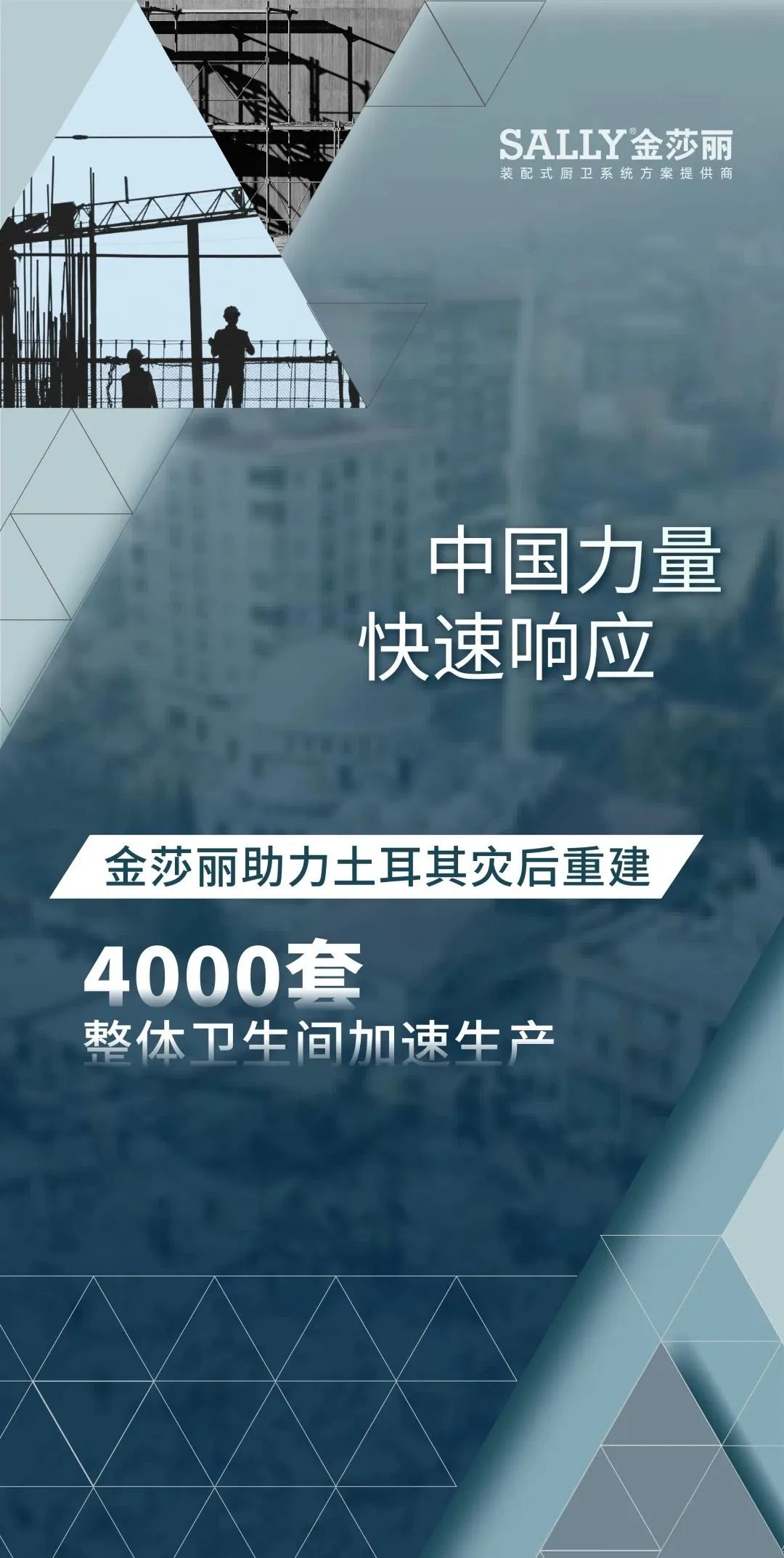 作为一家有温度的中国企业,面对突发情况,金莎丽在关键时刻再次展现出企业的实力和高度的社会责任感,积极配合土耳其客户在*短的时间内完成4000套卫生间的交付,预计一个月内完成交付。希望金莎丽的整体卫生间能为土耳其受灾群众遮风挡雨,为国际人道主义救援贡献“中国力量”。
