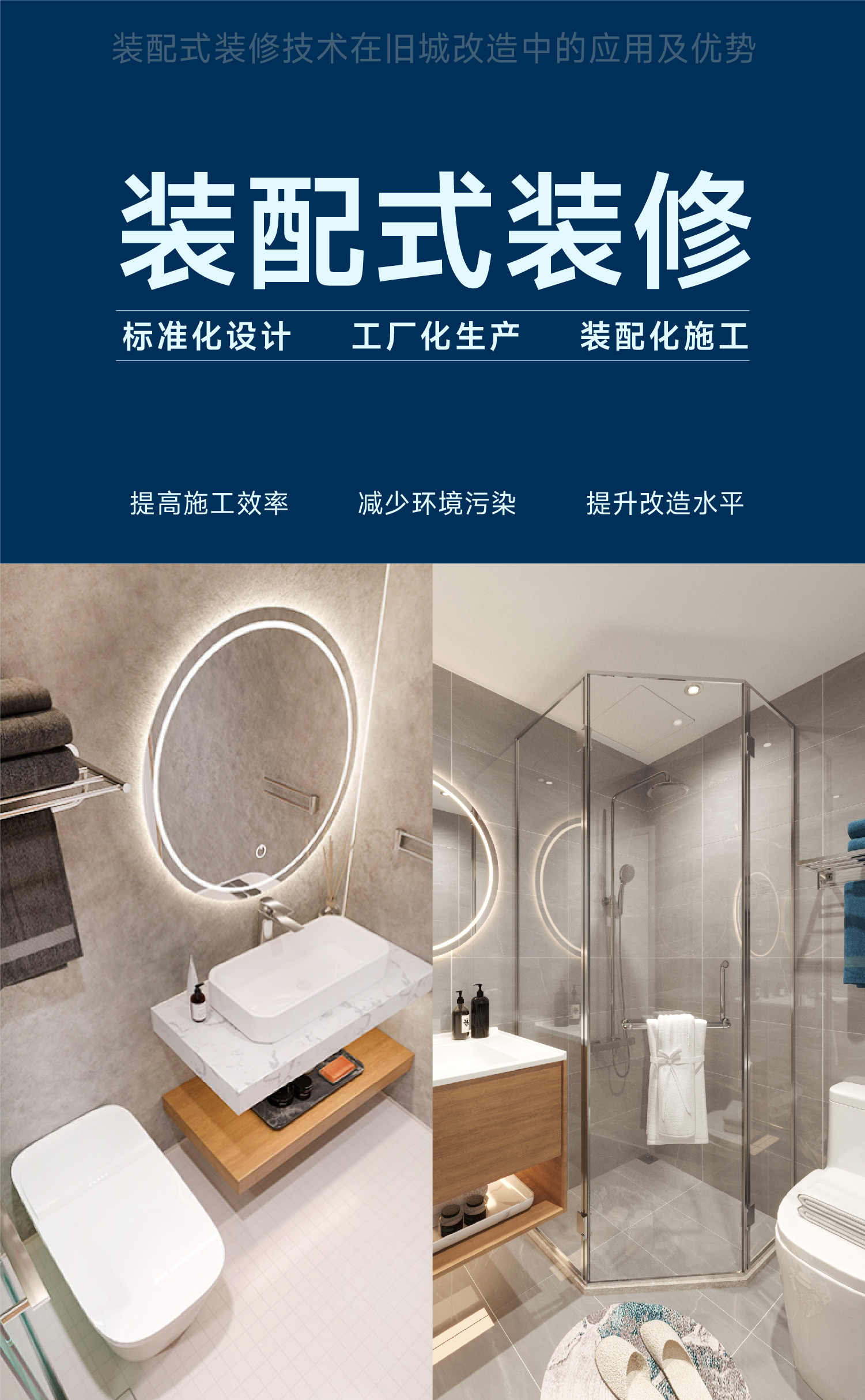 装配式装修通过标准化设计、工厂化生产和装配化施工为主要特征,实现工程品质和效率提升的新型装修模式,对建筑装修各阶段的技术集成及信息化管理,形成全流程服务平台,在平台支撑下完成装配式装修实施的全过程,使全部工期达到比传统要节省一半以上的速度,大大地提高施工效率,减少了现场湿作业、噪音粉尘污染、减少了建筑垃圾和碳排放。用工业化制造思维、乐高式装配技术工法,提升老旧居住建筑的改造水平,加快老旧小区改造速度。