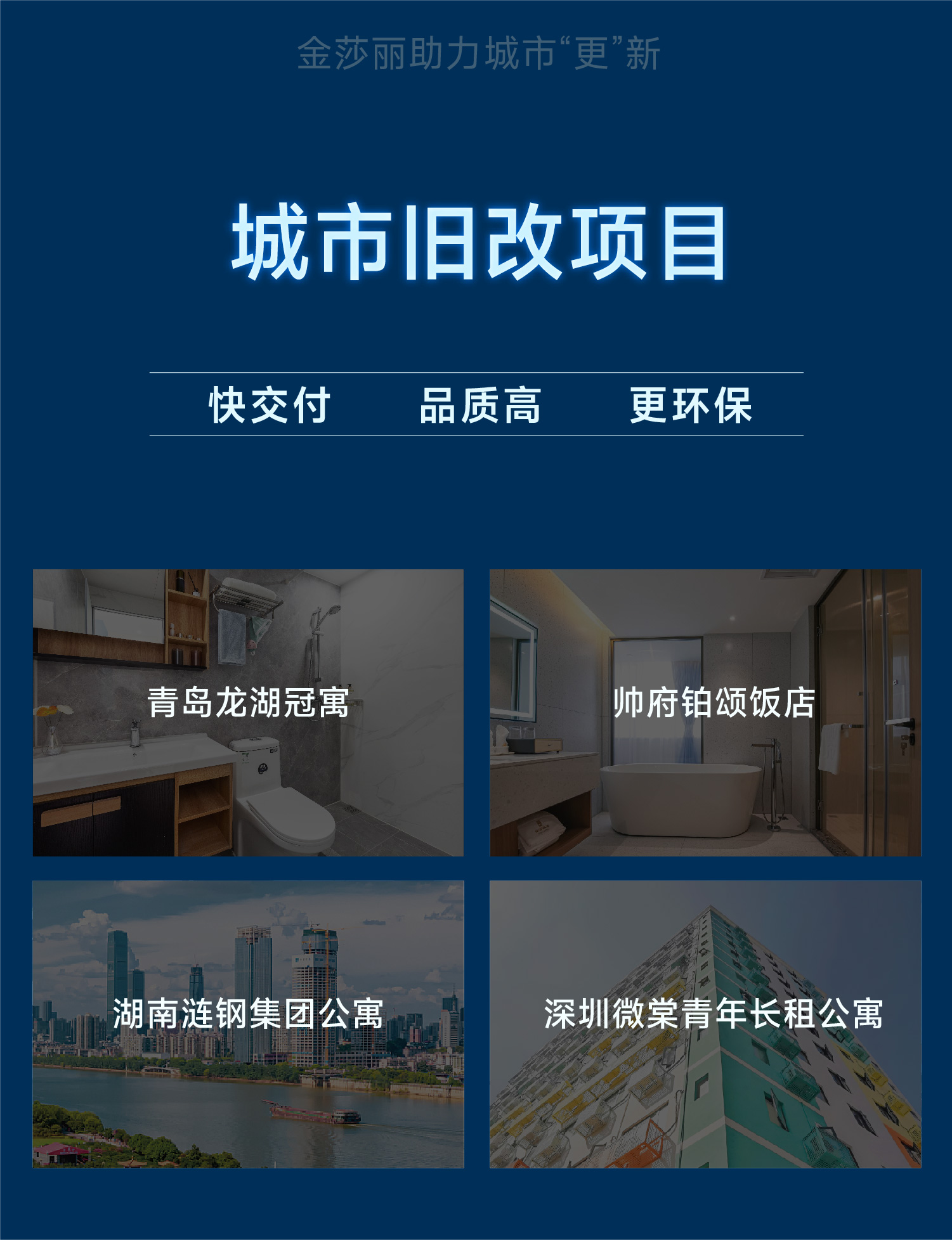 作为一家深耕装配式内装行业的企业,金莎丽凭借着自身不断创新的优势和多年来积累的为用户解决旧改方案的经验,一直以实际行动为旧城改造加油助力,旗下的装配式卫浴产品具有快交付、品质高、更环保、安装方便快捷,在城市更新项目中发挥着重要的作用。曾在青岛龙湖冠寓、帅府铂颂饭店、湖南涟钢集团公寓、深圳微棠青年长租公寓等旧改项目中,以舒适生活为前提打造温馨舒适的整体卫生间,通过装配式技术,全力打造一套能提升卫生间使用感受,同时又能降低工程难度的旧改解决方案,营造质感生活空间,保证居住者的安全舒适。